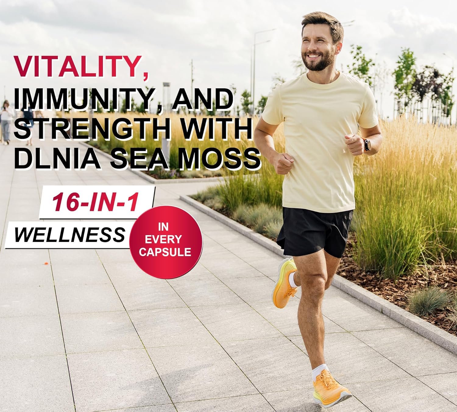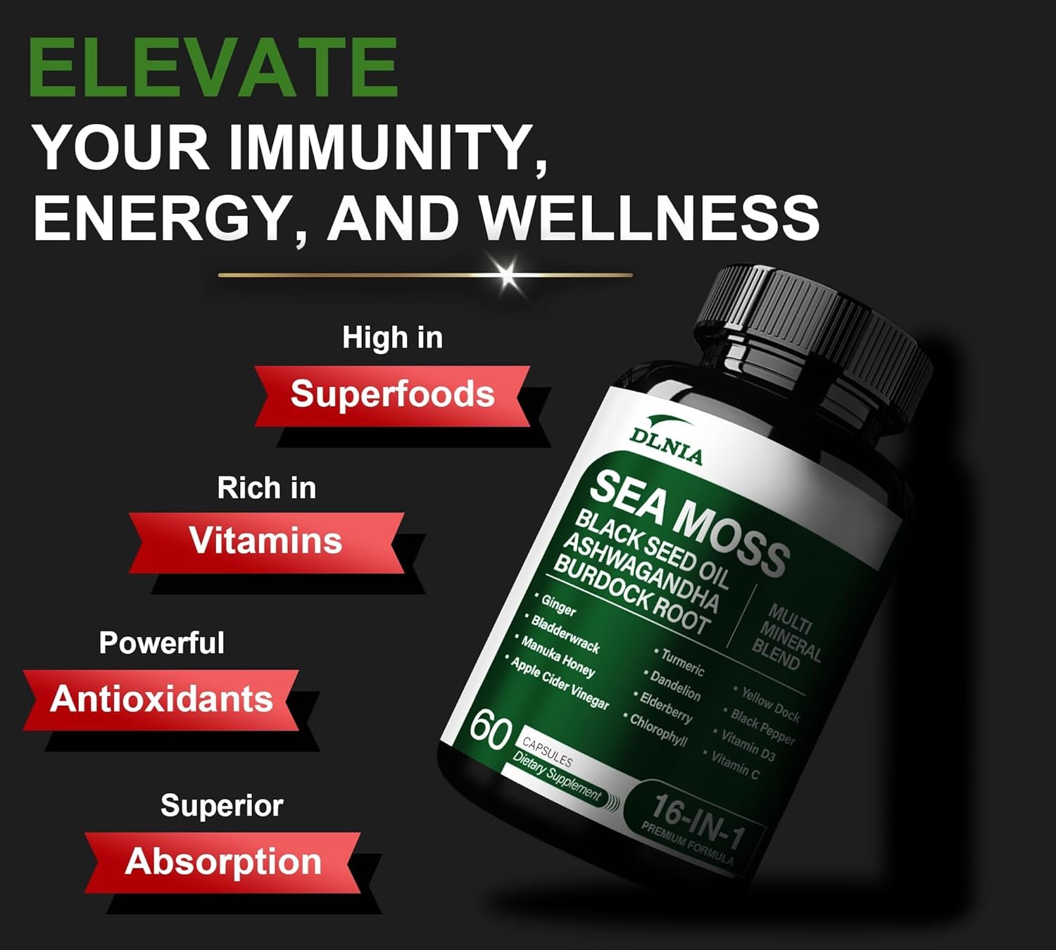 - EMBRACE OVERALL WELLNESS EFFORTLESSLY: Experience the synergy of 16 powerful organic ingredients, including sea moss, black seed oil, & turmeric, working together to support your immune system, joint health, & overall well-being; DLNIA 16 in one supplement capsules support healthy sleep patterns & enhance morning alertness, so you can spring out of bed feeling energized & ready to go