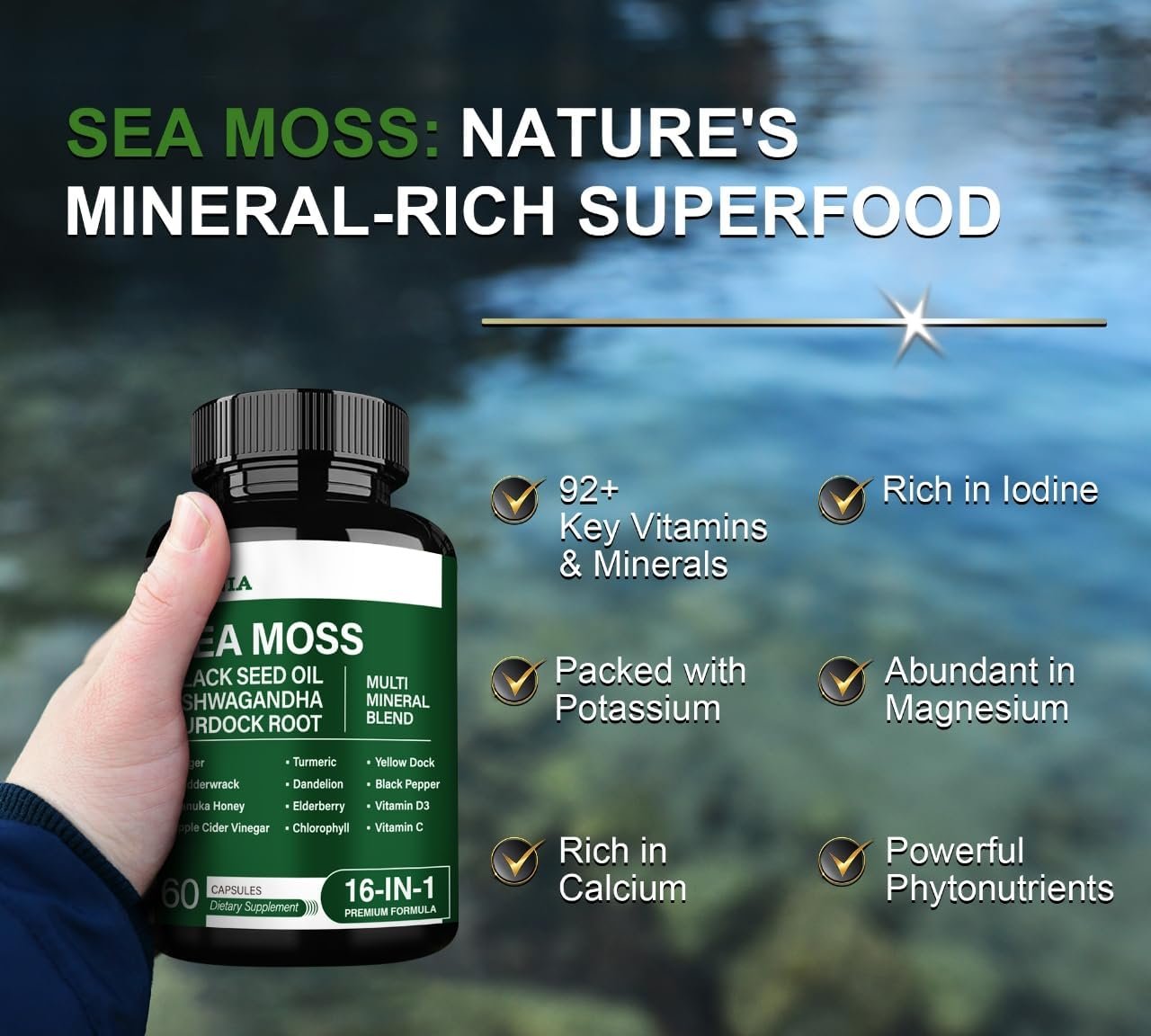 - 16-IN-1 MULTI-MINERAL SUPERFOOD COMPLEX: Supports natural energy, immune health, and skin wellness with Sea Moss, Ashwagandha, Black Seed Oil, Bladderwrack, Burdock, plus 11 more superfoods and minerals. DLNIA’s advanced formula offers more comprehensive nutritional support than sea moss gel in easy-to-take capsules without the mess or taste.