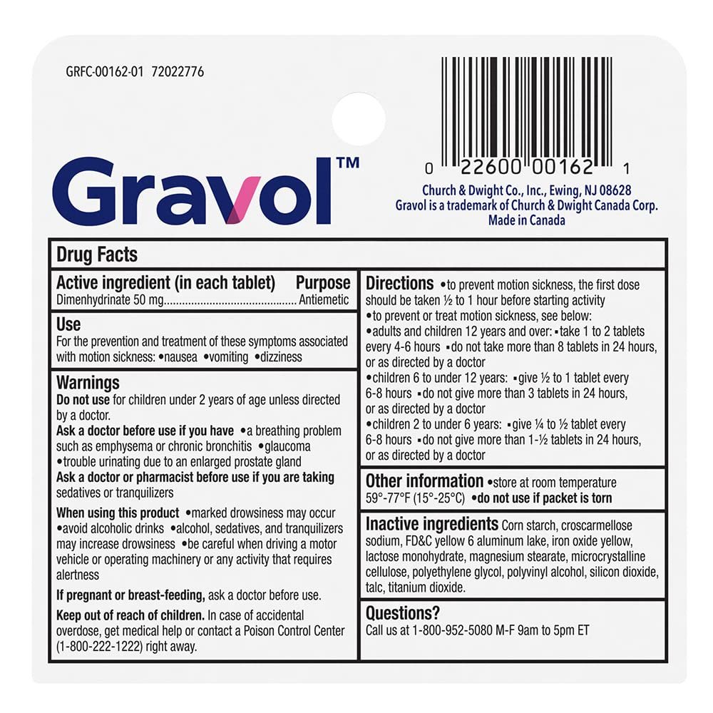 Fast, Effective Nausea Relief: When motion sickness strikes, Gravol provides relief for vomiting, dizziness, and nausea on the fly; feel better on road trips, airplanes, cruises, amusement park rides, and beyond