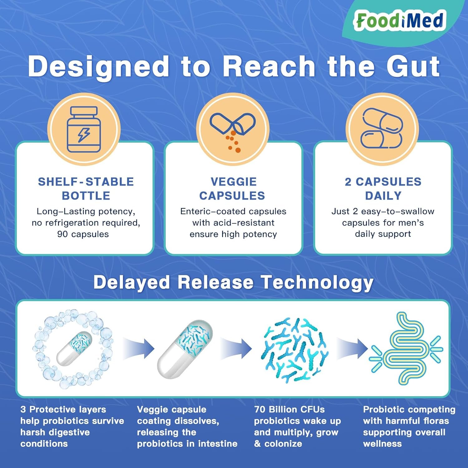 - High-Quality Formula – FoodiMed Men’s Probiotics with clean, safe, effective ingredients. Non-GMO, gluten-free, soy-free. Delayed-release veggie capsules help probiotics survive stomach acids and reach the intestinal tract. No refrigeration needed.