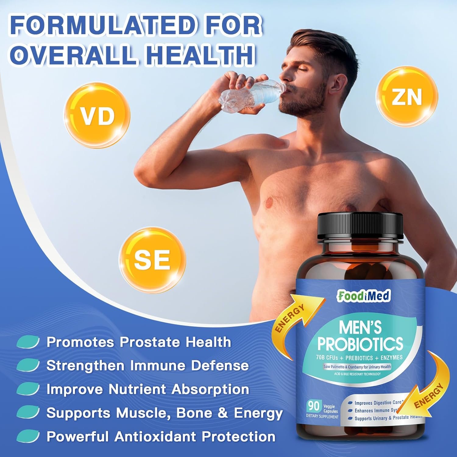 - Boosts Mens Energy Levels – FoodiMed Probiotics supplement for men’s digestive health & improve energy levels. Probiotics supplement are essential for men over 50, enhances body’s metabolism, and nutrient absorption, helps with higher energy and vitality.