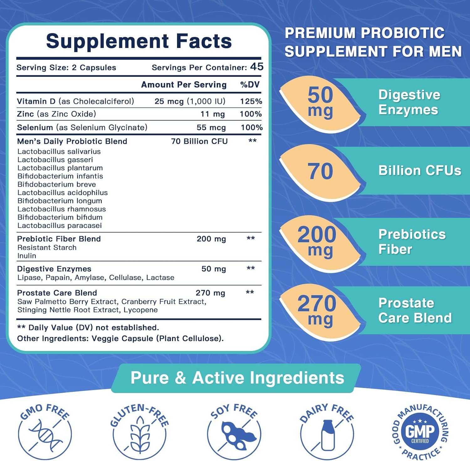 Probiotics for Men Digestive Health, 70 Billion CFUs Mens Probiotic with Enzymes & Saw Palmetto for Prostate